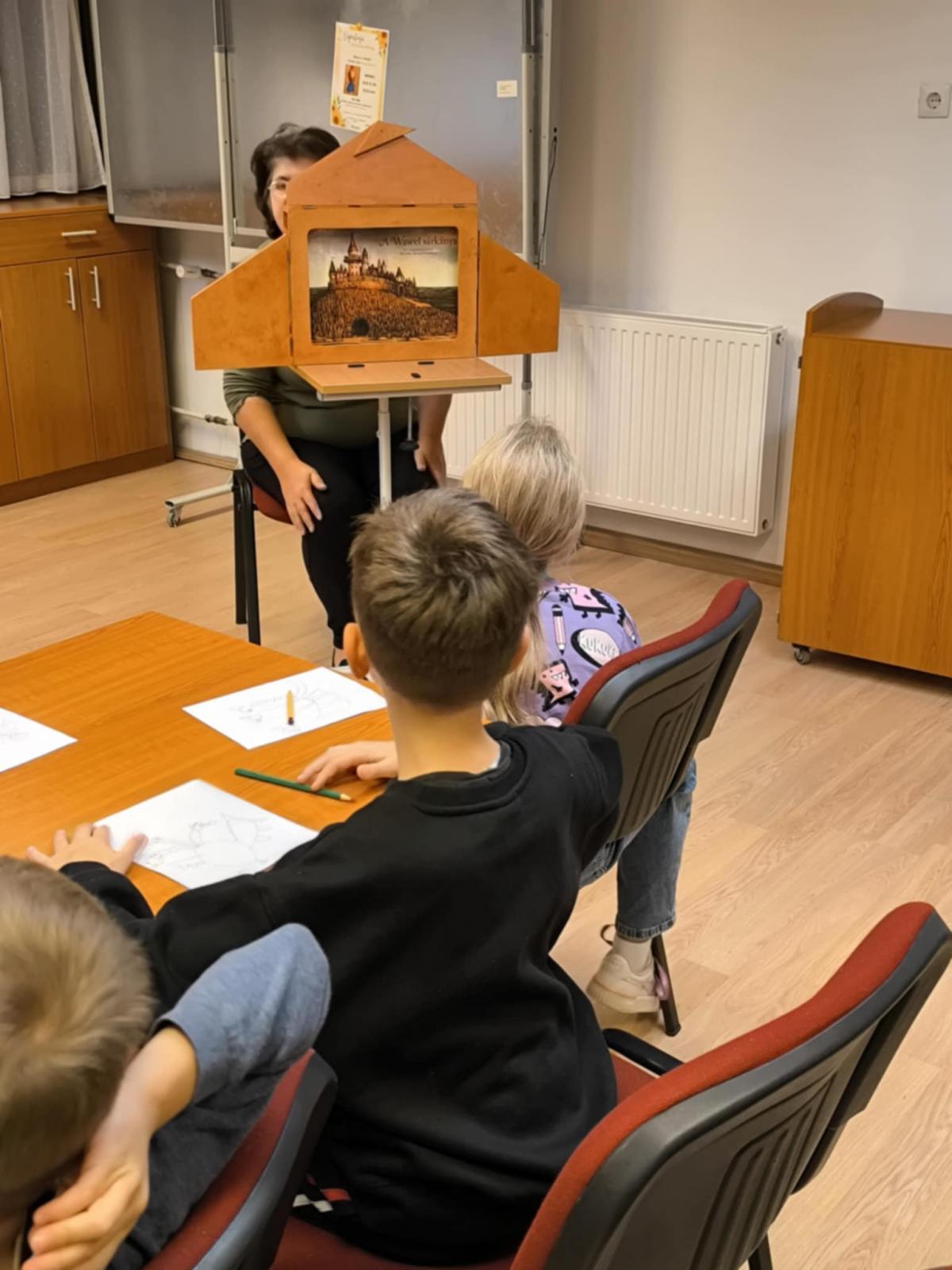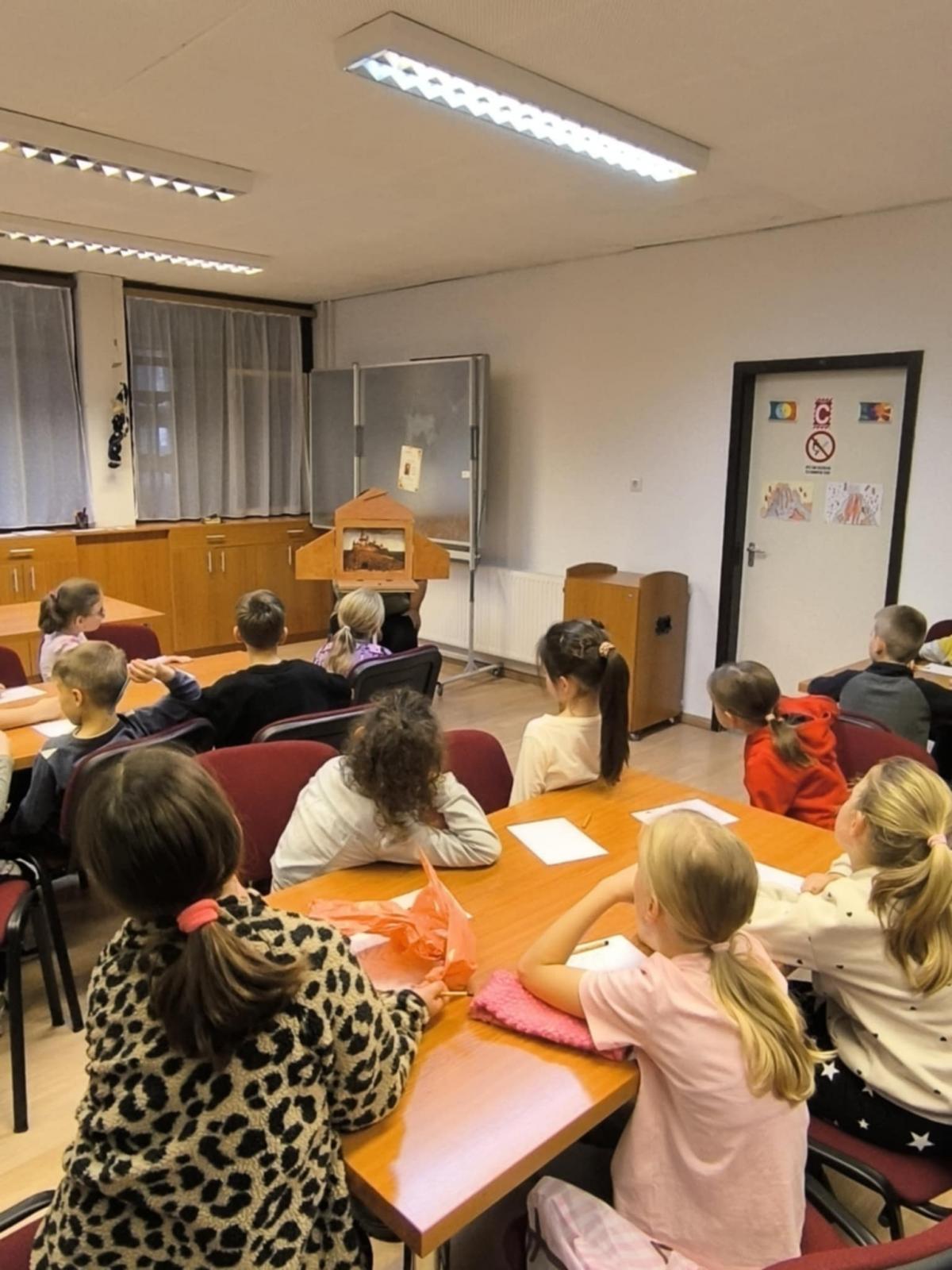 A könyvtárban az Eötvös József Általános Iskola másodikosai egy különleges mesefoglalkozáson vettek részt. A gyerekek „A Wawel sárkánya” című papírszínház-mesét ismerhették meg és dolgozhatták fel közösen.