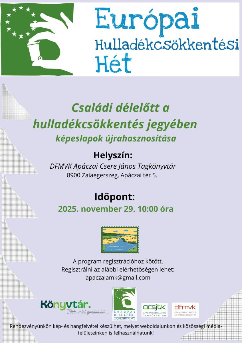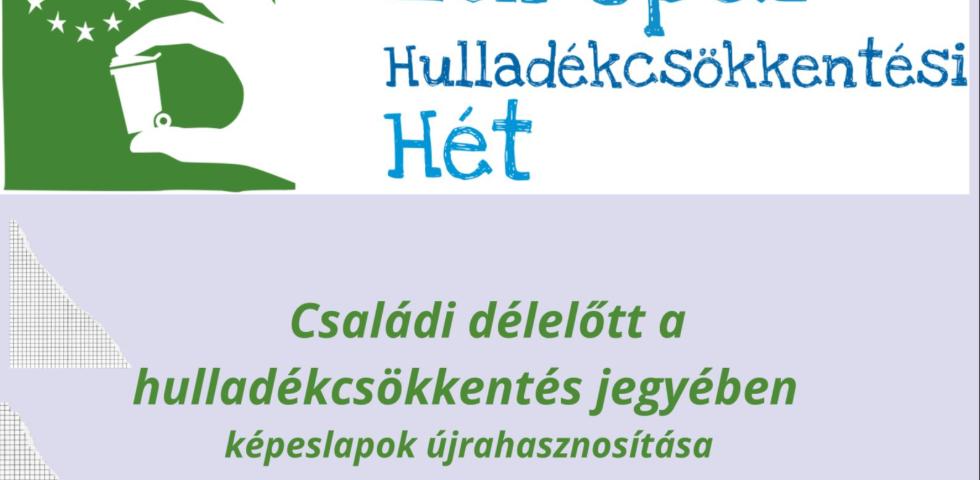 Az Európai Hulladékcsökkentési Hét országos programsorozaton belül kerül megrendezésre a Családi délelőtt a hulladékcsökkentés jegyében c. program. Részletek a plakáton.