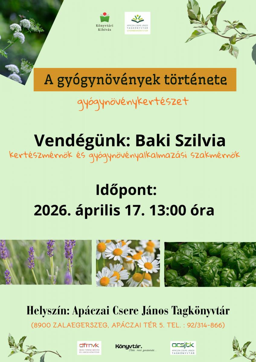 Herbalisták napja alkalmából érkezik a könyvtárba Baki Szilvia kertészmérnök, és gyógynövényalkalmazási szakember.