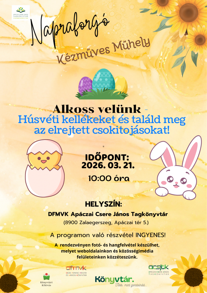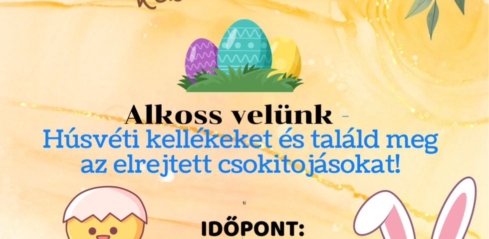 Készüljünk együtt a húsvétra egy vidám, alkotással teli foglalkozás keretében! A résztvevők saját kezűleg készíthetnek különféle húsvéti díszeket és kellékeket. Szeretettel várunk minden korosztályt egy kreatív, jó hangulatú délelőttre!