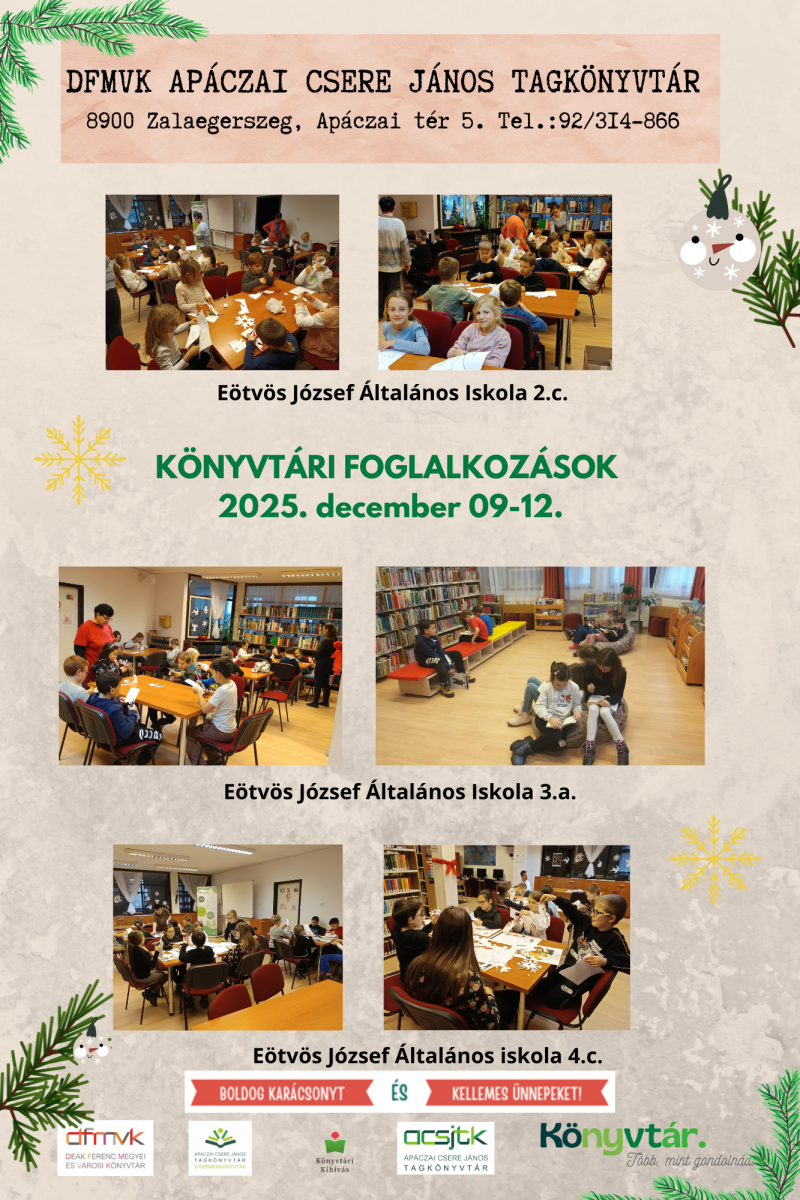 Az Eötvös József Általános Iskola tanulói könyvtári órán jártak nálunk, ahol ünnepváró kézműves foglalkozással készültünk számukra. A gyerekek gyönyörű ablakdíszeket készítettek a közelgő ünnepre hangolódva. Vidám, kreatív órákat tölthettünk együtt – köszönjük a lelkes részvételt!