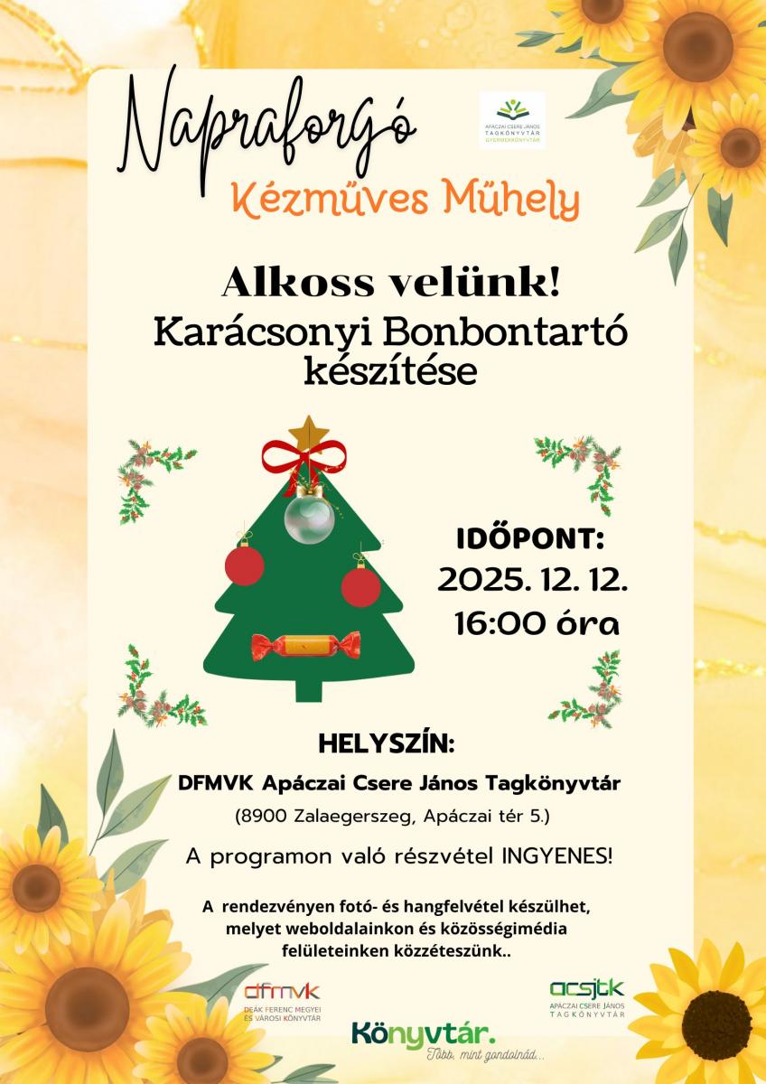 A Napraforgó Műhely következő foglalkozására 2025. december 12-én PÉNTEKEN 16:00 órakor kerül sor. Részletek a plakáton. Várunk mindenkit szeretettel!