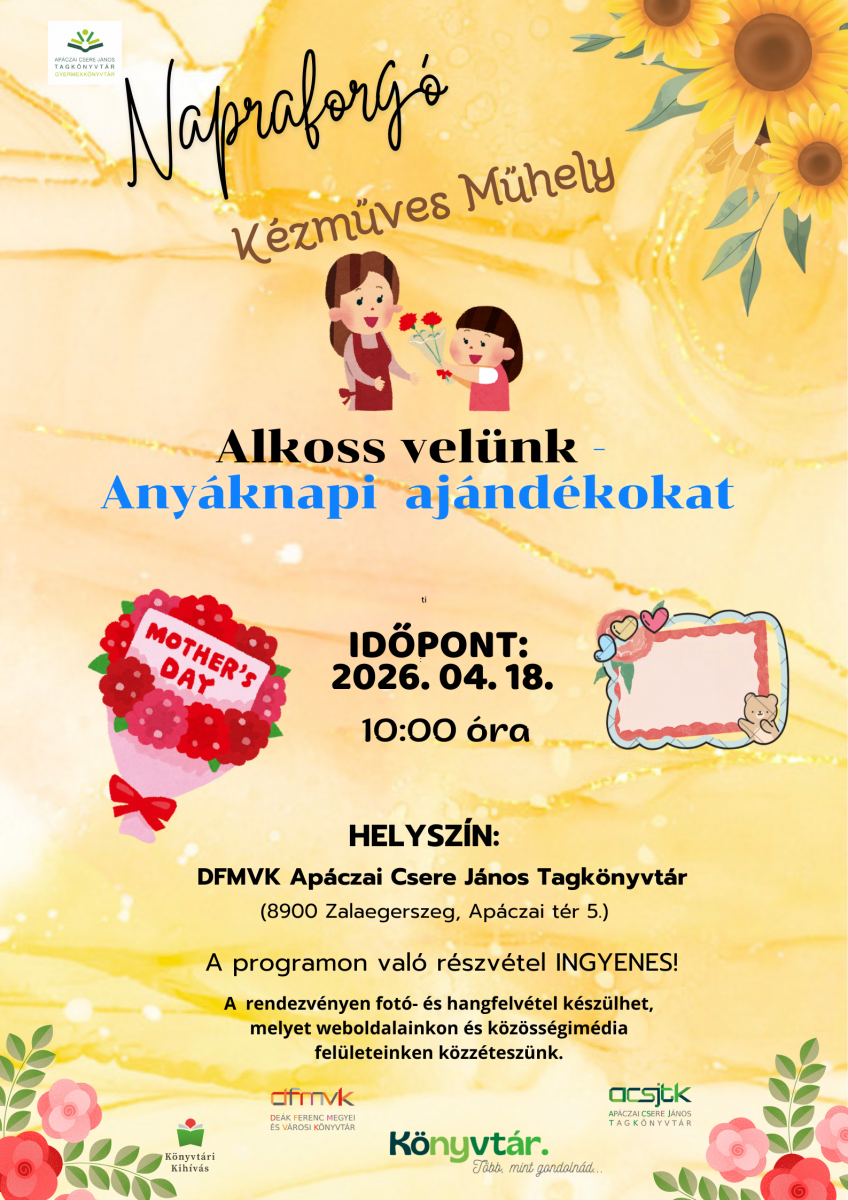 Szeretettel hívunk a Napraforgó Kézműves Műhelybe, ahol együtt alkotunk szívből jövő, egyedi ajándékokat Anyák napjára.