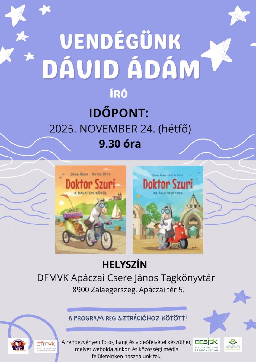 Dávid Ádám író lesz a vendég 2025. november 24-én, aki a Doktor Szuri köteteiről tart színes, mesés előadást. A program regisztrációhoz kötött, részletek a plakáton.