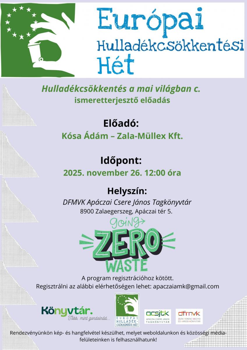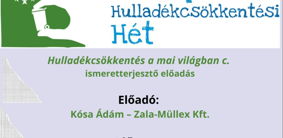 Európai Hulladékcsökkentési Hét országos programsorozaton belül kerül megrendezésre az alábbi ismeretterjesztő előadás. Részletek a plakáton.