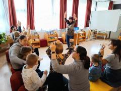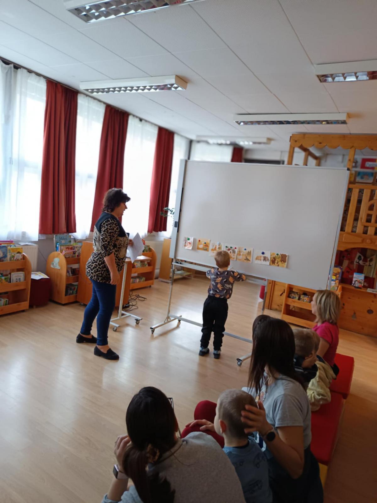 A gyerekek őszi dalokat hallgattak, majd együtt énekeltünk is. A foglalkozáso Márton-napi mesét is felolvastunk, melyet könyvnézegetés követett. A gyerekek birtokba vették a galériát is, ahol megnézegethették a képeskönyveket.